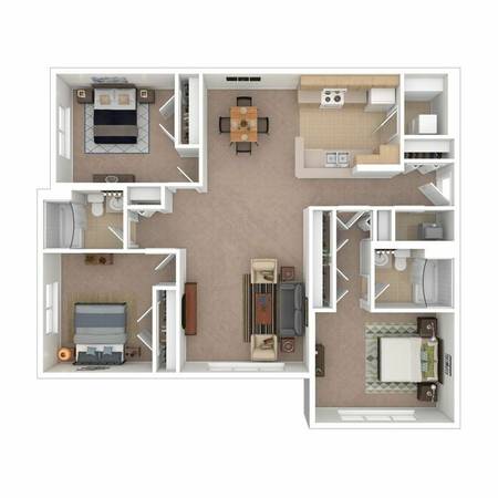 This two bedroom two bathroom apartment features a fully equipped kitchen, coat closet, walk-in closets, ensuite bathrooms, and a utility room with washer/dryer connections!