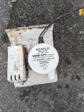 Used 2000 GPH Seaflo bilge pump. Comes with float switch and aluminium base. Both are pretty dirty, but the pump does appear to work when connected to a battery. Float switch is untested.