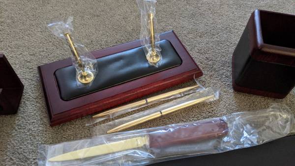 The perfect way to accessorize, protect, and organize your office in style! This complete desk accessory set contains everything you need to outfit your desk. All pieces are made in a luxurious rosewood with top-grain leather inlays. The non-slip foam dots on the bottom of the pieces make all of the accessories safe for your desktop surface, no risk of scratching.