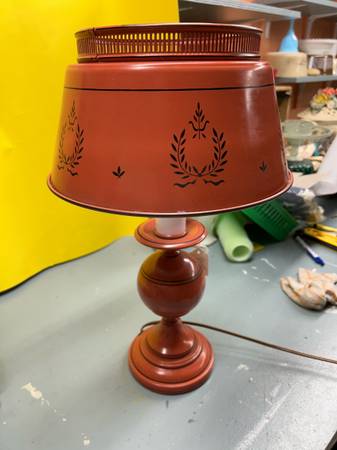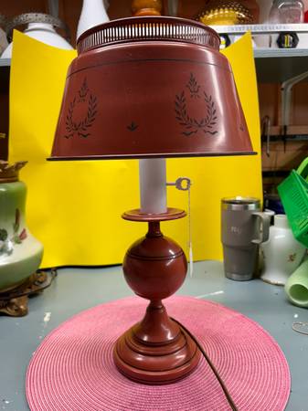 Often called a student desk Lamp. Incredible condition. Mid-Century styling. Hard to find in this condition lamp. Measures 17" tall and shade is 10" wide. These were named student lamps. The shade is painted and is metal. So when you have on a desk the light from bulb illuminates the desktop. Call JAMES anytime at show contact info