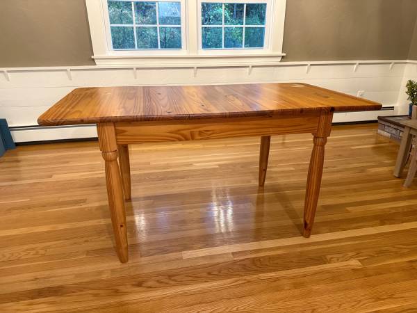 Wooden kitchen table with removable leaf. Table is 30” high and tabletop is 31.5” x 59.5” including the 14” leaf. Leaf is included in picture. There is an area with some cosmetic heat damage on one corner. Otherwise good condition. Legs are easily removable for transfer and storage. Buyer will need to pick table up from our home.