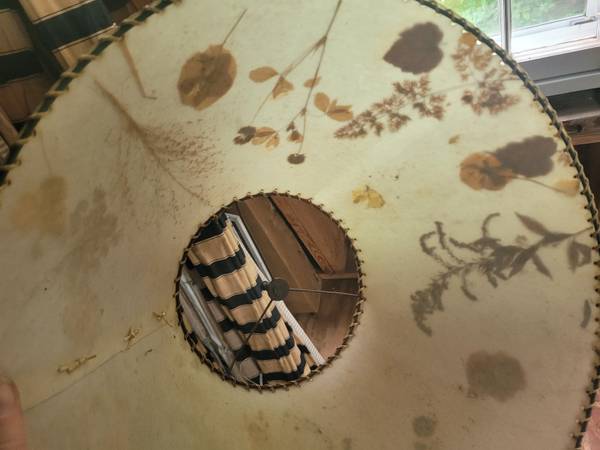 a wooden dowel attached to a metal base. Shade is attached to a brass trumpet like arm that houses the light assembly. Original Shade is made of fiberglass containing a design made up of flowers, leaves, and barley trimmed out with spiral rope leather accents.