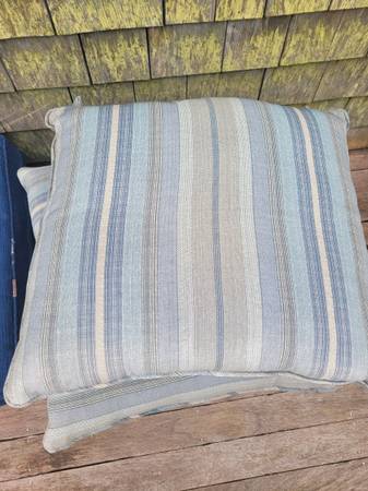 Come get these great cushions to upgrade or replace your old cushions. I have 2 sets (seat and back) of navy blue and 1 set of stripe blues that compliments the navy blue sets. These are for outdoor use but can be used indoors as well.