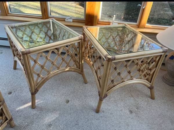 Get these beautiful Rattan end tables that come with a glass top. Brilliant rattan design. They are in excellent condition and ready for your beach house, guest quarters, vacation retreat, etc. Also have matching chairs that include ottomans up for sale being sold separately on another CL ad.