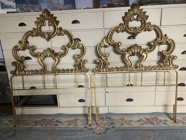 THIS IS A PAIR OF RARE TWIN BED HEADBOARDS COMPLETE WITH BOTH FRAMES, ORNATE LOUIS XV ROCOCO/ HOLLYWOOD REGENCY STYLE, HEAVY GOLD TONE CAST METAL, APPROX. 38" WIDE, 56" TALL, 1" DEEP. GREAT...